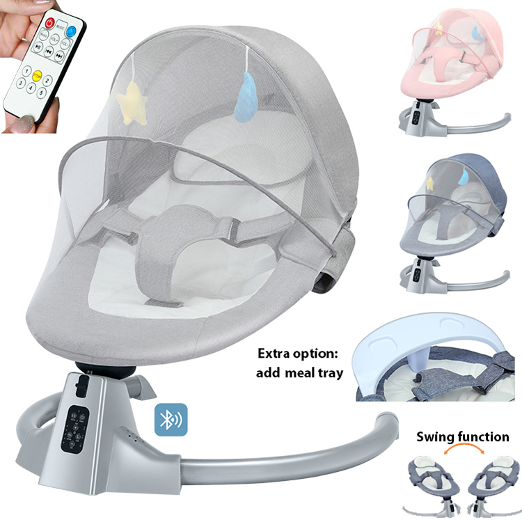 Battery-operated swing chair for baby, with R/C and music, bluetooth speaker, two hanging soft toys, mosquito net, pillow and 3-point hardness